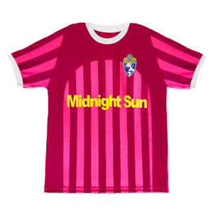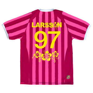 Midnight Sun pink stripe soccer jersey, featuring a striking Midnight Sun print and crest on the front, with a floral 'Larsson 97' design on the back.